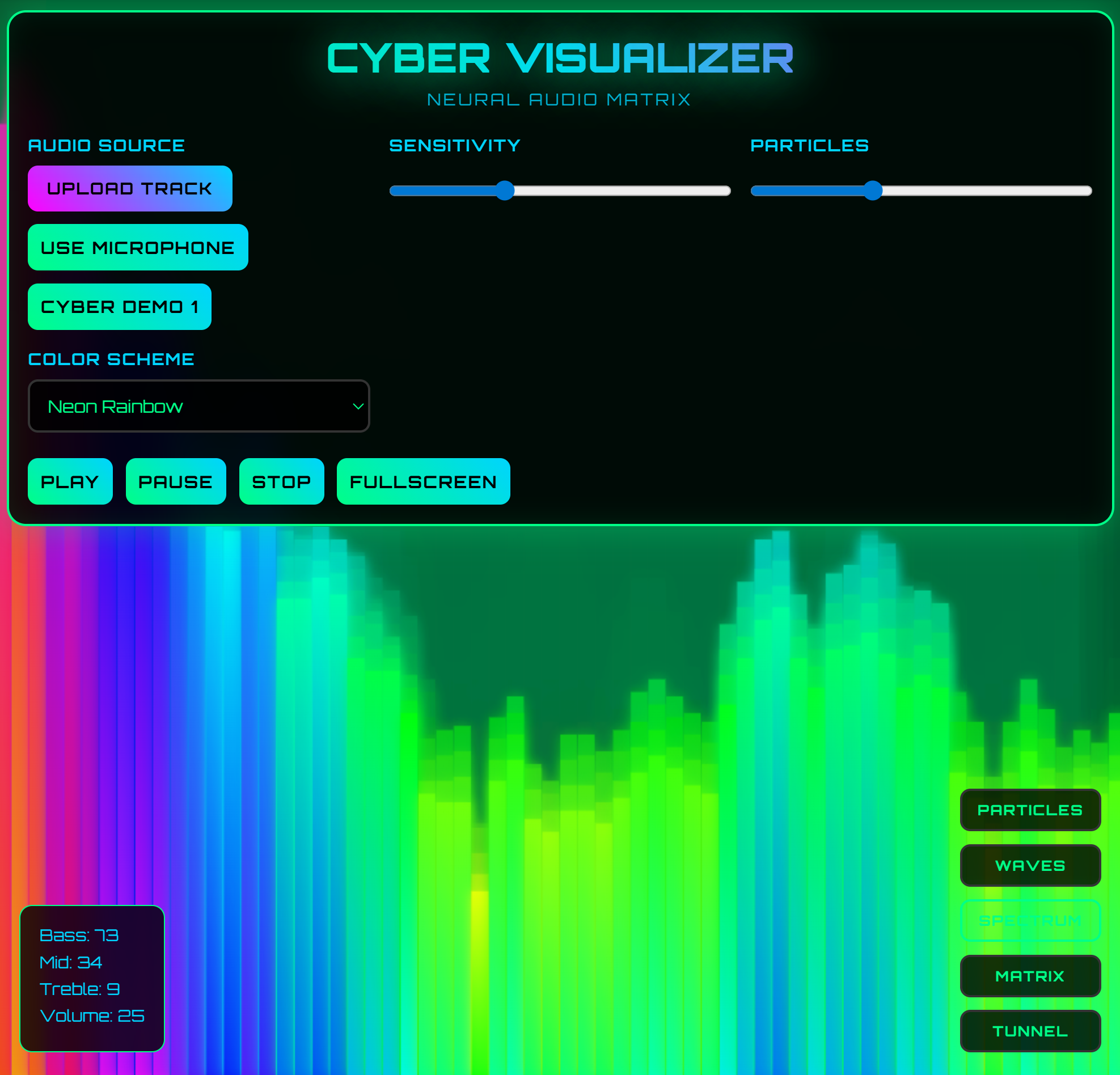 An audio-reactive cyberpunk visualizer with real-time frequency analysis and neural matrix aesthetics
