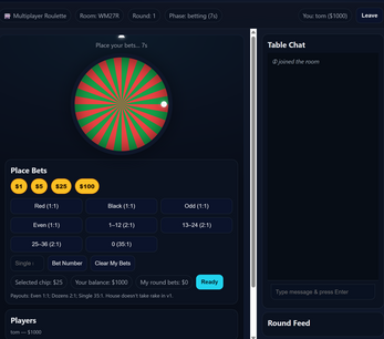 Real-Time Bets & Payouts — Place chips on Red/Black, Odd/Even, dozens, or single numbers. Bets update live for everyone.