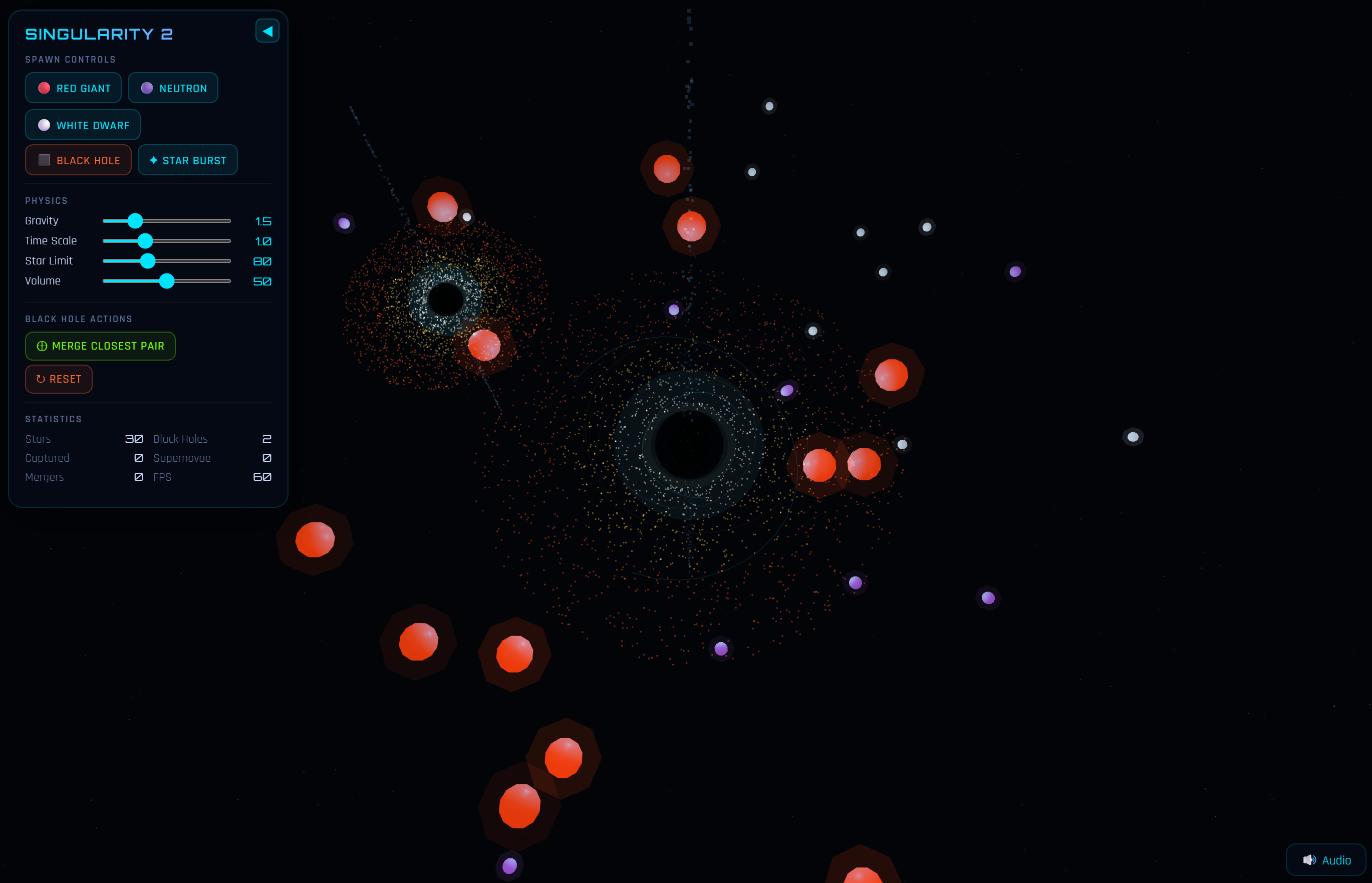 Singularity Playground 2 is a real-time 3D gravitational sandbox. You control a cosmic playground where black holes devour stars, supernovae light up the void, and merging singularities shake the fabric of spacetime. There are no scores, no win conditions — just you and the universe.