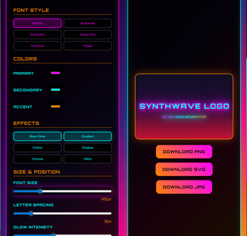 Generate professional synthwave logos with real-time preview, multiple effects, and authentic retro styling. Perfect for musicians, streamers, game developers, and synthwave enthusiasts.